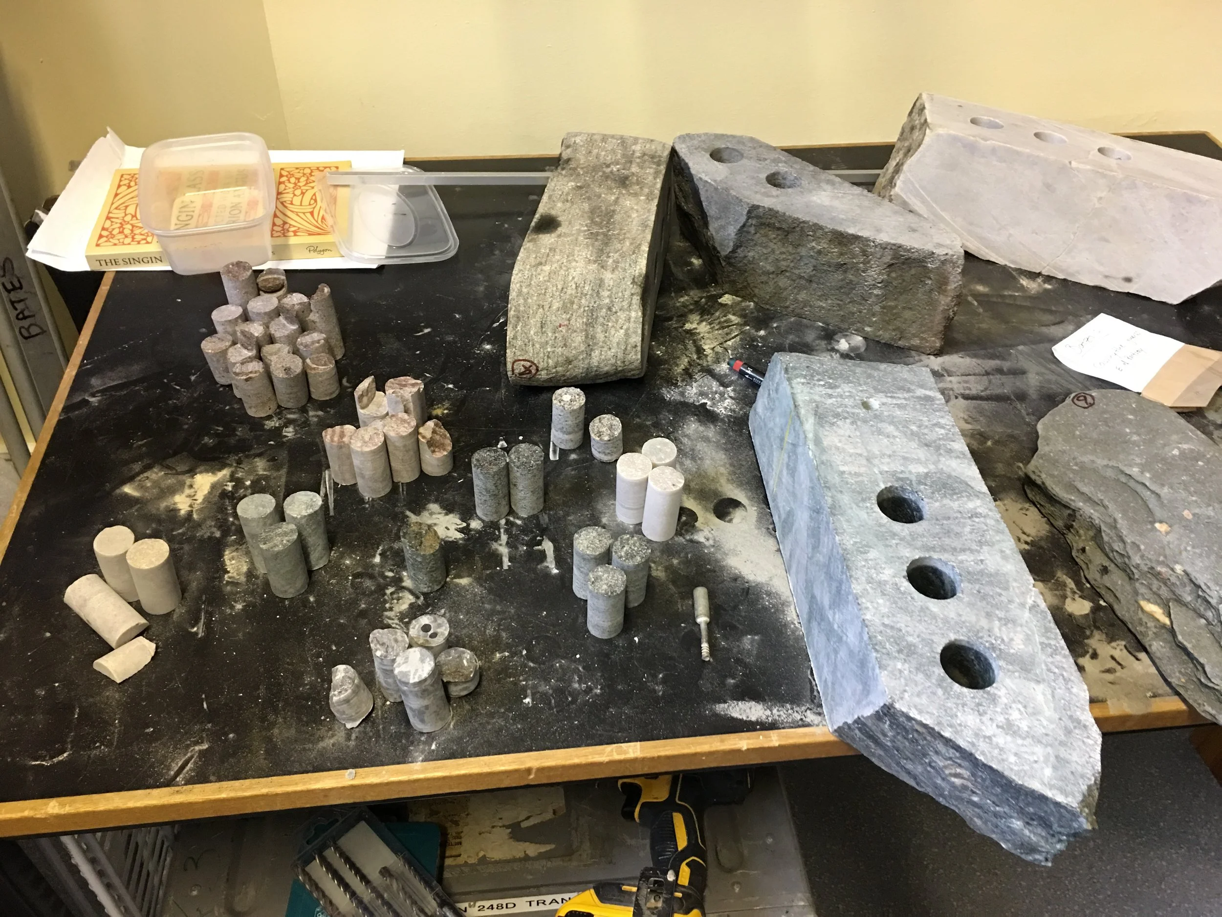 Stones exist in different states. Natural and unweathered stones are still attached to the earth. Weathered stones have become detached and transformed by the elements. We called these ‘natural’ and ‘honed’ stones we continued the honing process with a set of the natural stones. This entailed experimentation in cutting, drilling, hanging and striking the stones with stone itself, wood and metals. We explored aspects of sound resonance and amplification by striking the stones with various materials in the Silo and recording their sounds. These can be heard in samples below.