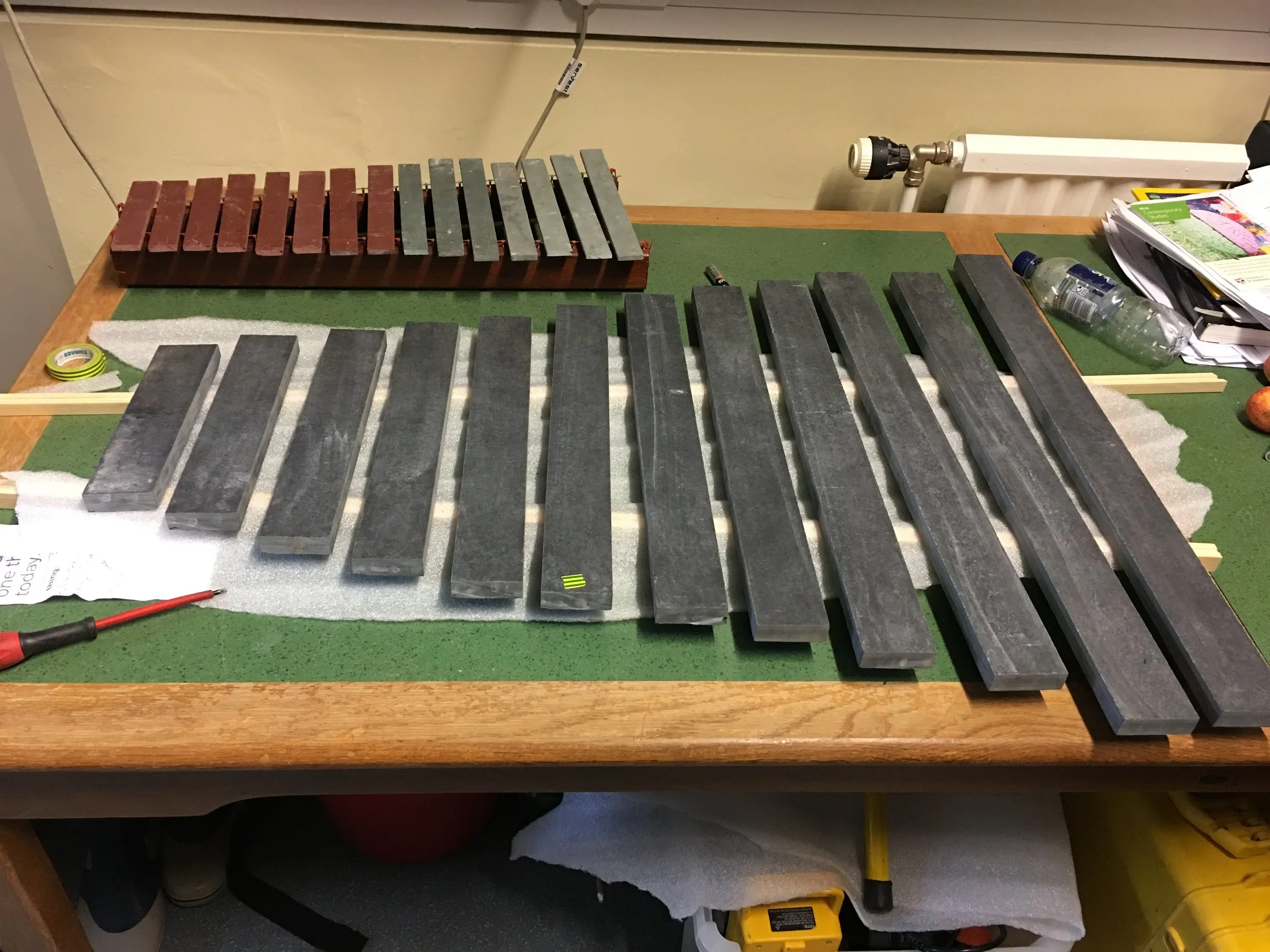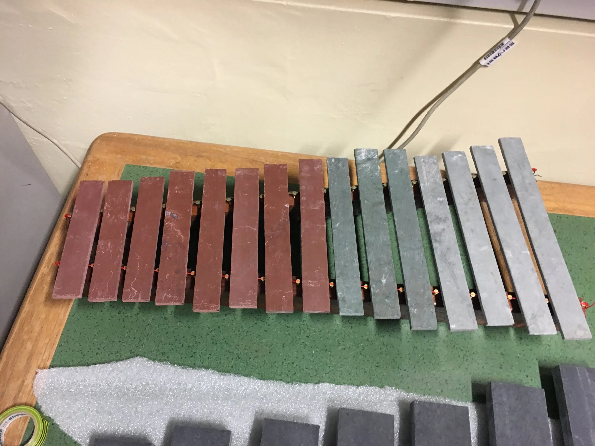 We were not attempting to produce a pitched/tuned Lithiophone as a musical instrument. We attempted to sound a time series of natural stones, amplify their qualities for performance and feel their vibrancy. We are not the first project to try to make art with stones via a constructed ‘lithophone. An example of sounding stones by Marten Bondestam can be found here: https://youtu.be/TOmel9EtL-E. Our project therefore sits as it were historically between the archaeological discovery of the use of stones for sounding and the later contemporary fashion for the building of tuned instruments made of stone. This history is relevant.