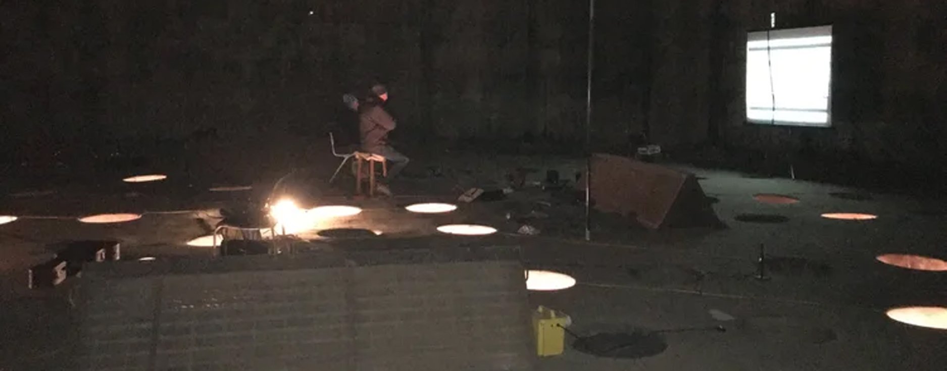 In the third visit a screen and dance floor had been installed. We played with projections of video and performers in front of the screen and with the effect of shadows. Some of these are presented here and in particular the performance by Claudia Labaou (voice) and Claire Garabedian (cello).